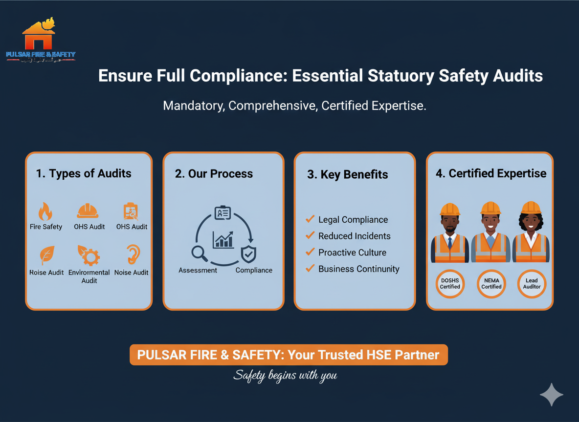 As your trusted HSE Partner, Pulsar Fire & Safety provides the expertise and reliability necessary for all your statutory audit needs. Partner with us to achieve a proactive safety culture and operational continuity.