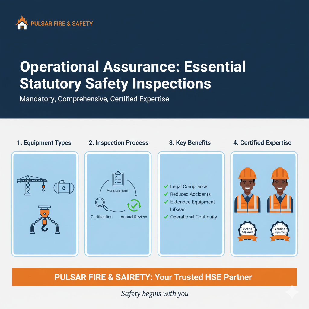 Statutory Safety Inspections are a mandatory requirement under the Kenya OSHA Act 2007. These inspections are crucial for assessing the condition and safety compliance of all plant machinery used in your operations. The goal is to ensure the protection of life and the continuity of operation by verifying that all equipment is safe and fit for use.